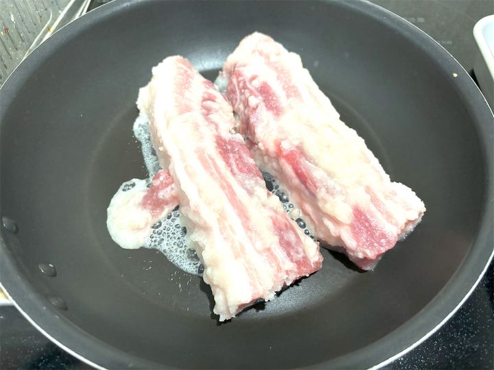 鍋(またはフライパン)を温めて1の豚肉を並べて入れます。