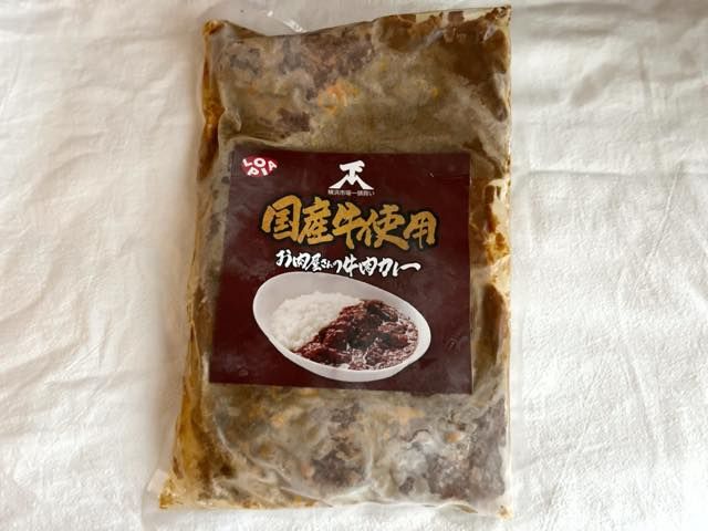 冷凍食品コーナーに、一際目をひくパッケージをした「お肉屋さんの牛肉カレー」を発見。店頭POPにはデカデカと「国産牛使用」「横浜市場一頭買い」と表記されていました。