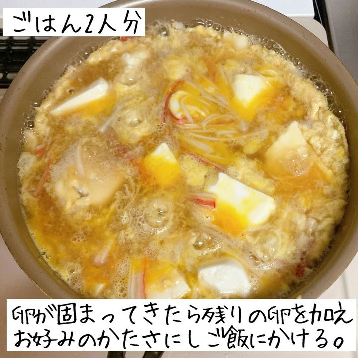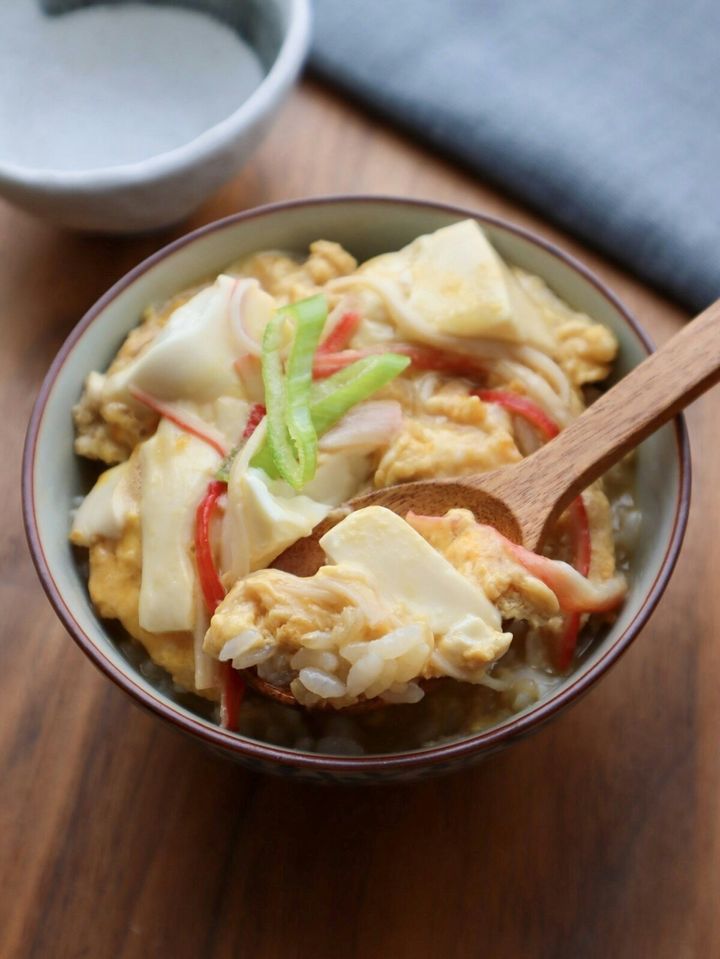 卵、絹ごし豆腐、カニカマを使った卵とじ丼。ほっと優しい甘辛い味付けの卵とじは、おなかも心もほっこり満たしてくれますよ。