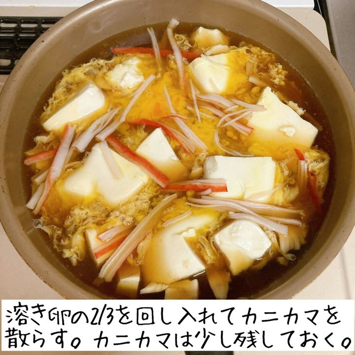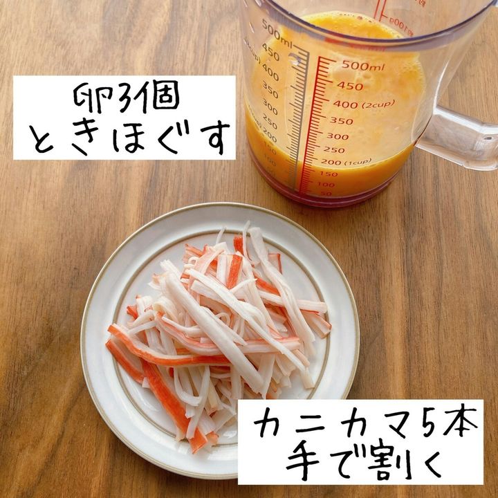 溶き卵の2/3を回し入れてカニカマを散らす。