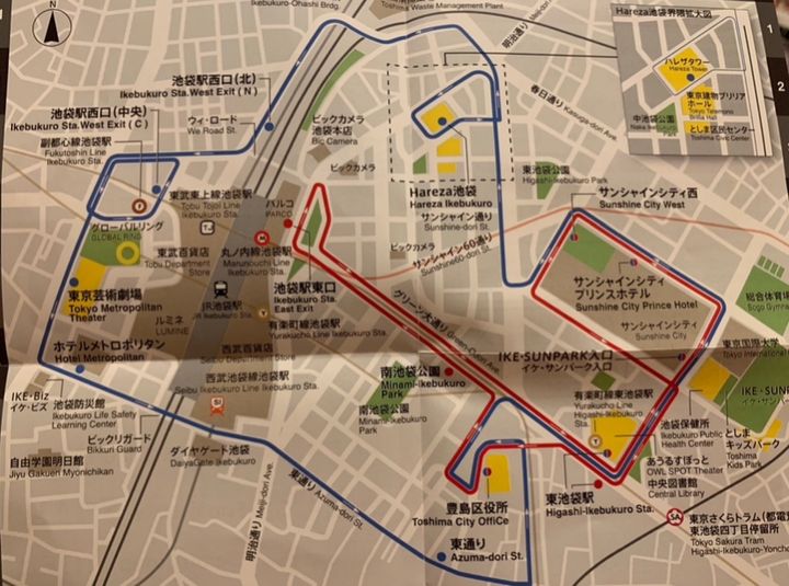 コースはAルートとBルートがあり、Aルートは池袋駅の東口を通り、Bルートは池袋駅の北口や西口を通ります