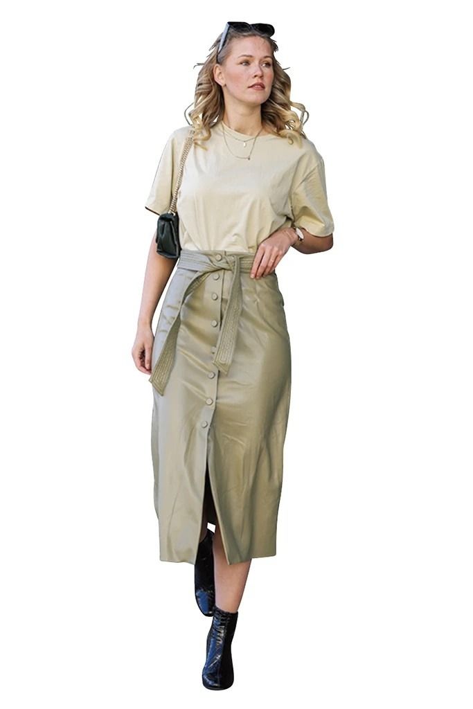 メンズライクなトップスなのに穏やかな表情でまとえる、淡いベージュのTシャツを新調。同系色のレザースカートでタフに寄せても、あいまいな色でほどよいエッジにとどまる。