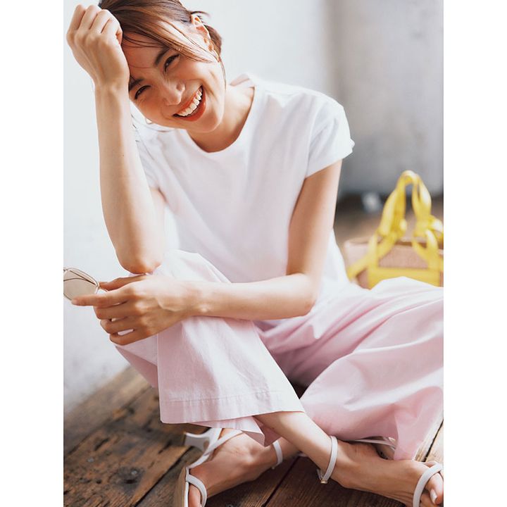 Tシャツ¥6,820(ルームサンマルロクコンテンポラリー)ワイドパンツ¥20,900(アンクレイヴホワイト/オンワード樫山)サングラス¥44,000(アイヴァン/アイヴァン東京ギャラリー)ピアス¥91,300(ウノアエレ/ウノアエレジャパン)バッグ¥23,100(ヴィオラドーロ/ピーチ)サンダル¥14,850(ダイアナ/ダイアナ銀座本店)