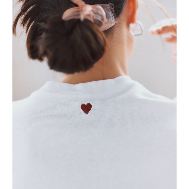 昨年即完したバック刺繍Tシャツ。1枚でもカジュアルすぎない、しっかりとした厚みのあるコットン生地が便利。ホワイト×赤ハートはVERY STORE別注カラー。チャコールは赤ハート、ブラックは青ハートの刺繍が施されています。