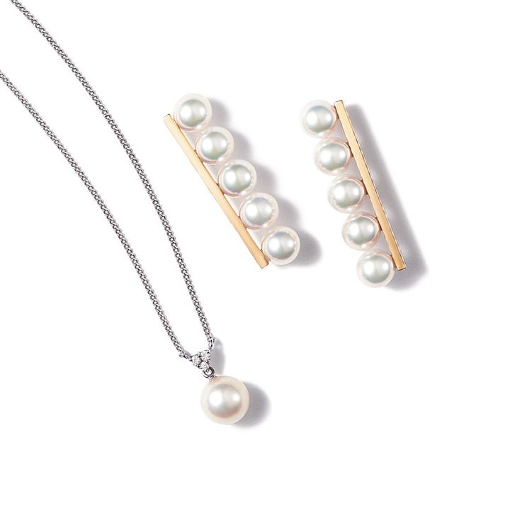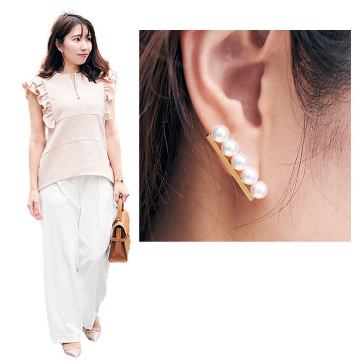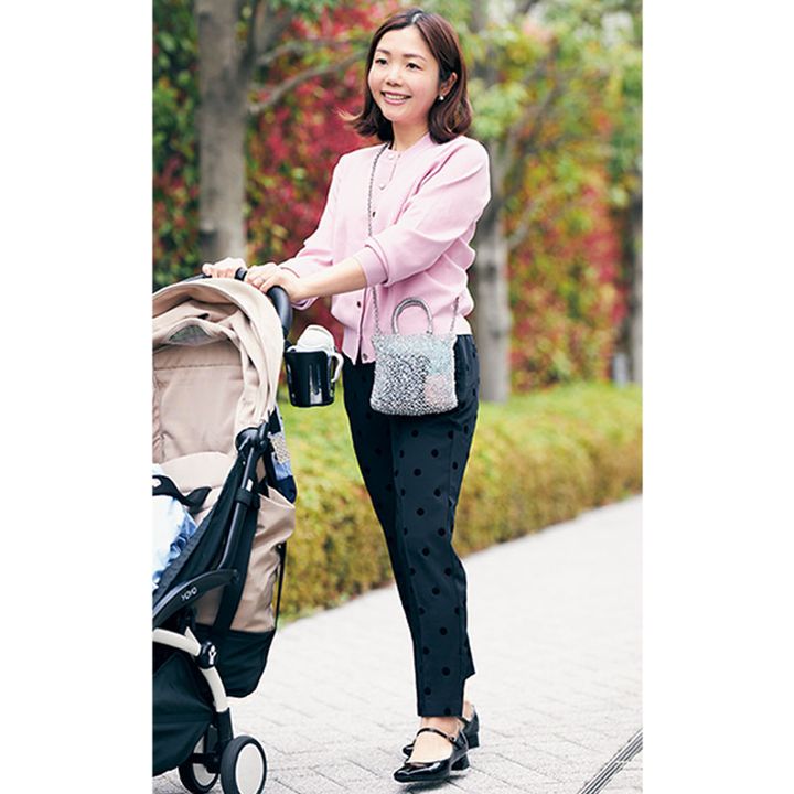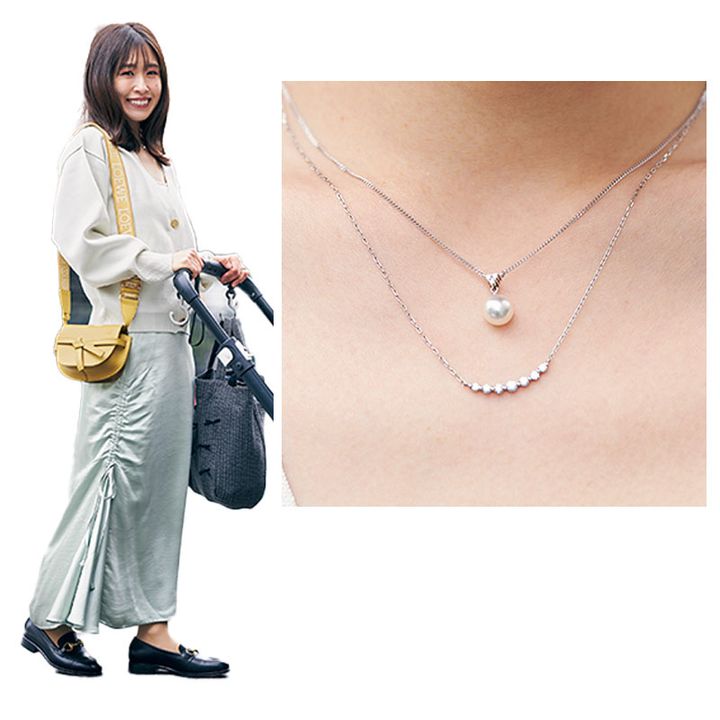 優しげなオーラを放つハイクオリティなブランドのパールジュエリーがママたちの心を摑んでいます。華やかさと品の良さを持ち合わせているからコーデの邪魔をせず、様々なシーンで大活躍。普段着オシャレも盛り上げてくれること間違いなし!(ジュエリーはすべて読者私物)
