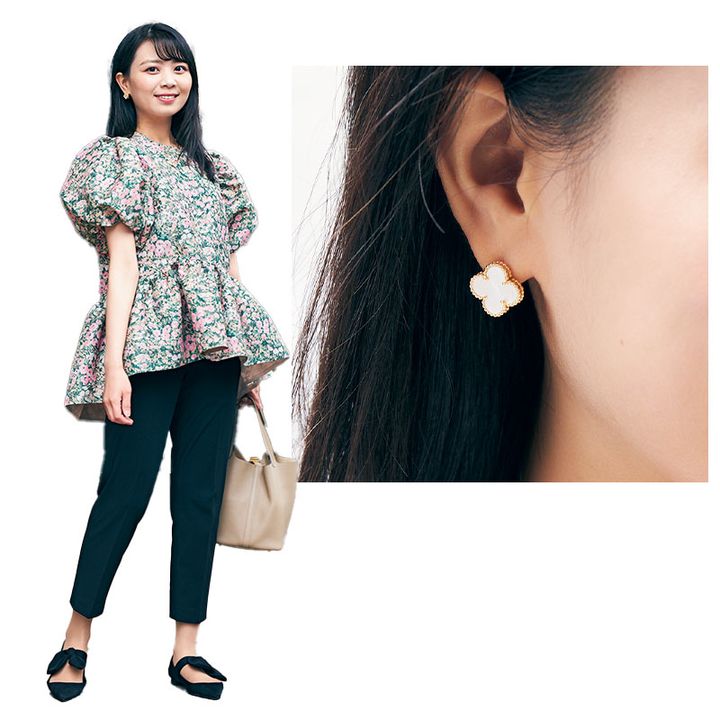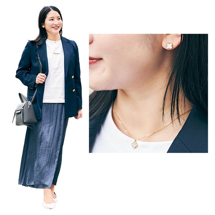 夫の単身赴任と出産のお守りに。コーデに華を添えてくれます 「夫の単身赴任で遠距離生活がスタートした時期と出産の際にお守りや記念の意味を込めて購入しました。好みの甘めコーデに合わせやすく、華やぐのが魅力です」 ツルバイマリコオイカワ UNIQLO ツルバイマリコオイカワ HERMÈS ※私物につきエルメス ブティックへのお問い合わせはお控えください。