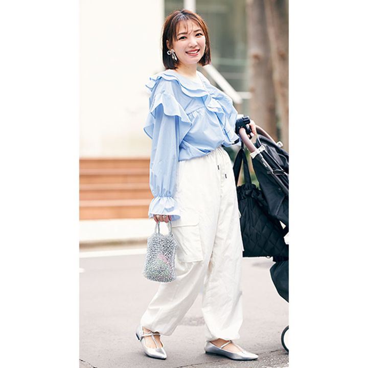 雨の日も気兼ねなく♡年中使える素材が魅力 「キラキラ感がアクセサリー代わりになり、パッと華やいで、ラフなコーデもサマになるためヘビロテしています。ベビーカーを押していても平たいので当たらず煩わしさもありません」 PLST、FITMORE、LE TALON
