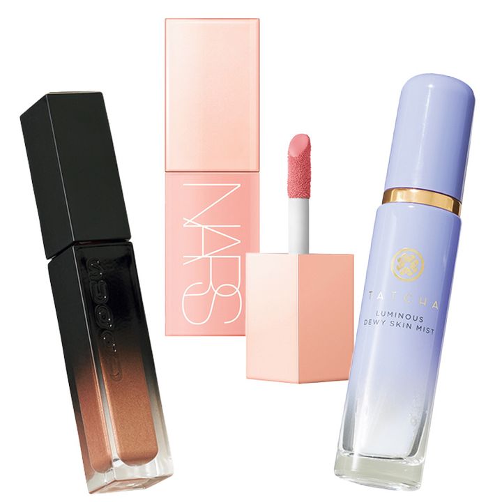 \ チークやシャドウもリキッドに統一! / 〈左から〉SUQQUのリクイド ラスター アイズ。チークにNARSのアフター グロー リキッドブラッシュ。最終仕上げの艶だしにタッチャ ルミナス デューイ スキンミストをひと吹き。