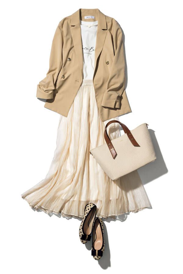 ジャケット¥13,970/NATURAL BEAUTY BASIC スカート¥24,200/ジャスグリッティー Tシャツ¥2,748/grove(ワールドプレスインフォメーション) バッグ¥13,900/CHARLES & KEITH シューズ¥13,750/ダイアナ(ダイアナ 銀座本店)