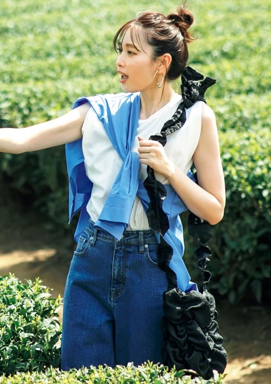 ボウタイ付きシャツ¥22,000/アンタイトル キャミ×ノースリセット(Tシャツ)¥20,900/Stola. カーブデニムパンツ¥22,990/リネイヴ(オンワード樫山) ギャザーショルダーバッグ¥5,940/キャセリーニ フープイヤリング¥3,500/ルナシック(ロードス)