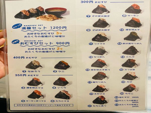 メニューは、おむすび単品で頼めるほか、「満腹セット1200円(税込)」「おむすびセット900円(税込)」があります。 ほとんどのお客さんがどちらかを注文している感じでした。