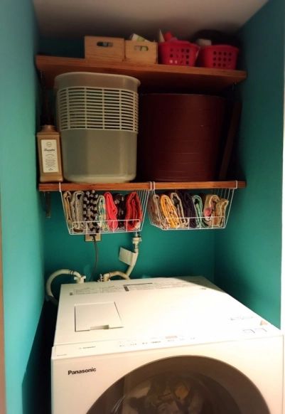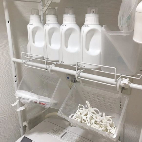 ドラム式洗濯機では、洗濯機上のスペースも見逃せません。洗濯機上の棚と洗濯機の間にあるスペースに吊るすタイプのカゴを引っ掛けると、収納スペースを増やせますよ。