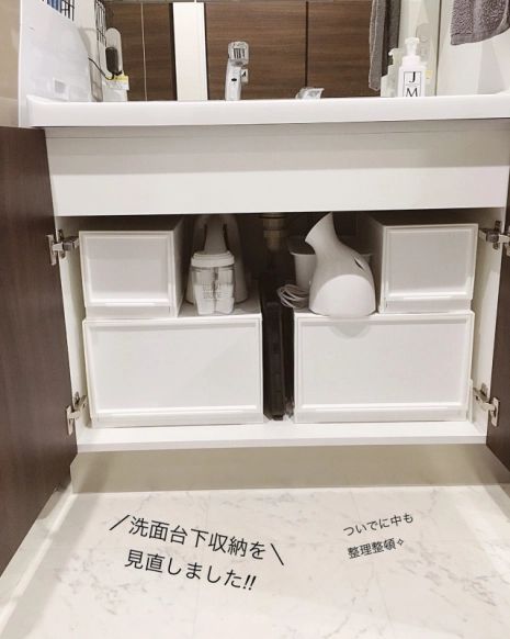 @yuma_ismartさんは、洗面台下のスペースにいくつも引き出しを入れて、最大限収納スペースを確保。色や形もそろっているので、扉を開けたときのスッキリ感もありますね。引き出して使えるので、立ったままでも中の物を取り出しやすくて◎。