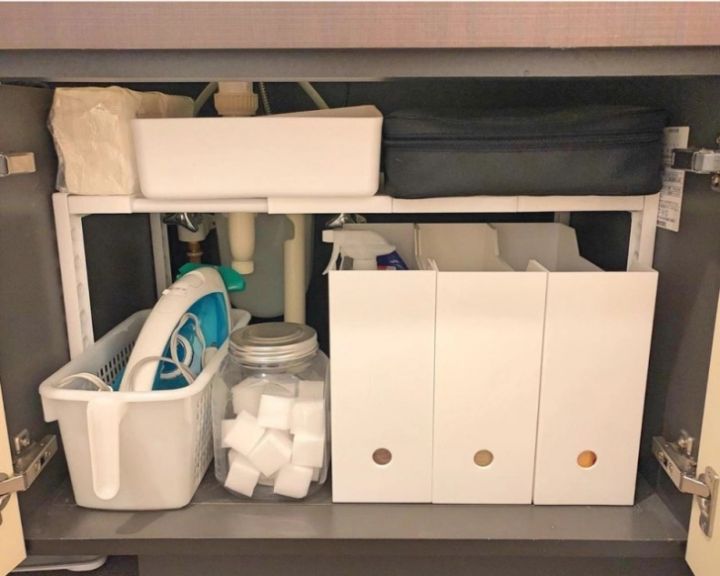 @ponpom_lifeさんが洗面台下の収納に役立てているのは、ニトリの伸縮ラックだそう。ラックを使うことで、一段分収納スペースが生まれるので、一気に収納力があがりますよ。伸縮ラックの下の段も、ファイルボックスを利用した隠す収納でスッキリと物を収納していますね。