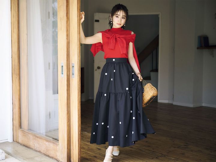 とびりきおしゃれしておでかけしたい週末は、ぜひドラマチックなコーデに挑戦を! トレンドのヴィヴィッドな赤に、黒ベースのモノクロドットを合わせて、パリシックな装いに。美人百花6月号から6月15日(土)のおすすめコーデをご紹介します。