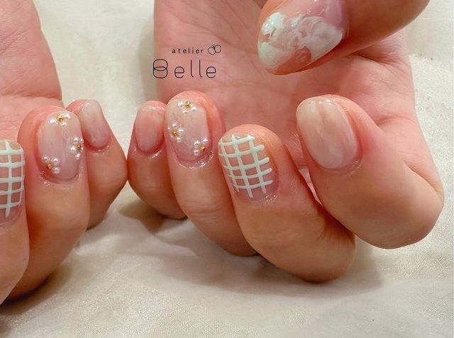 3. 【上品パール×チェック】おすすめ!可憐なパールフラワーと繊細チェックアートで可愛い指先に!