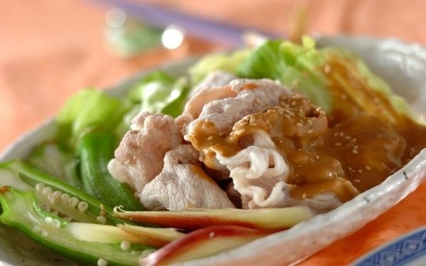 「お肉も野菜も食べたい…!」という方には豚しゃぶサラダがイチオシ。自家製のゴマダレが美味で、献立全体の満足感を上げてくれます。暑い日はミョウガをたっぷりとのせていただきましょう。