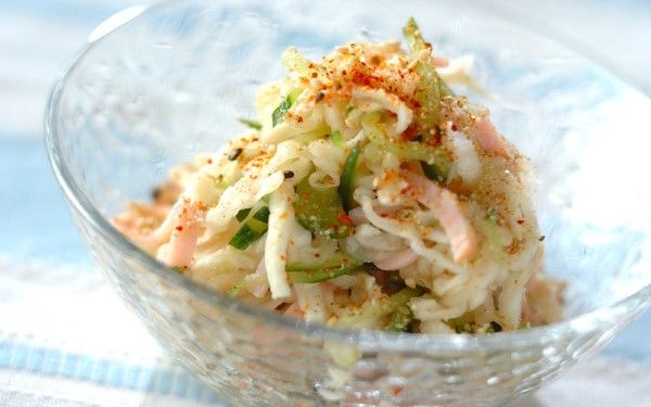 サラダの定番キュウリとハムに、切り干し大根を加えるだけで旨味爆発! ポリポリとした食感が心地良く、お酢入りドレッシングでさっぱり食べられます。切干し大根は食物繊維が豊富なので、納豆パスタと合わせれば、腸活献立の完成です。