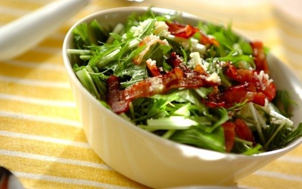 和風パスタの具材によく使う水菜は、納豆パスタとも好相性。カリカリのベーコンをトッピングすれば、香ばしさがUPしてモリモリ食べられますよ。ドレッシングは洋風でも和風でも合うので、気分で選びましょう。