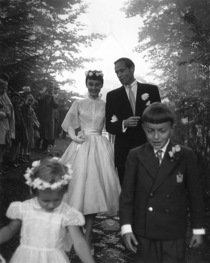オードリー・ヘップバーンが最初の夫、俳優のメル・ファーラーとの結婚式にてまとったウエディング・ドレスは、バルマンによるデザイン。ハイネックにボリュームのあるパフスリーブ、ウエストのビッグリボンなど、清楚さと可憐さに満ちた一着です。
