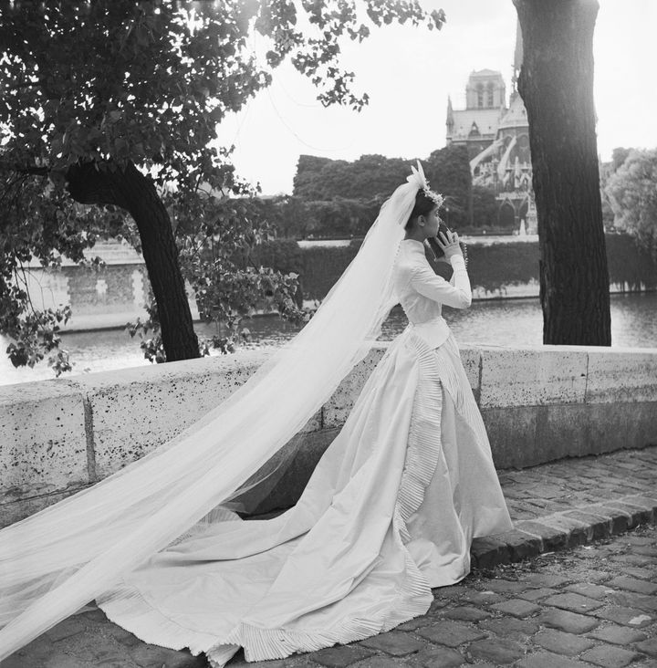 パリのノートルダム大聖堂を背に、バルマンのウエディング・ドレスを着てシューティングをするモデル。メリハリの効いたシルエット、立体的なプリーツがドラマチックな陰影を描いています。