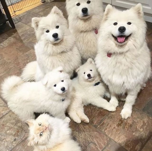 白くてモフモフな毛が特長のサモエド。 5匹のサモエドの中に混ざっていたのは・・・、同じく白くてモフモフなニャンコ。
