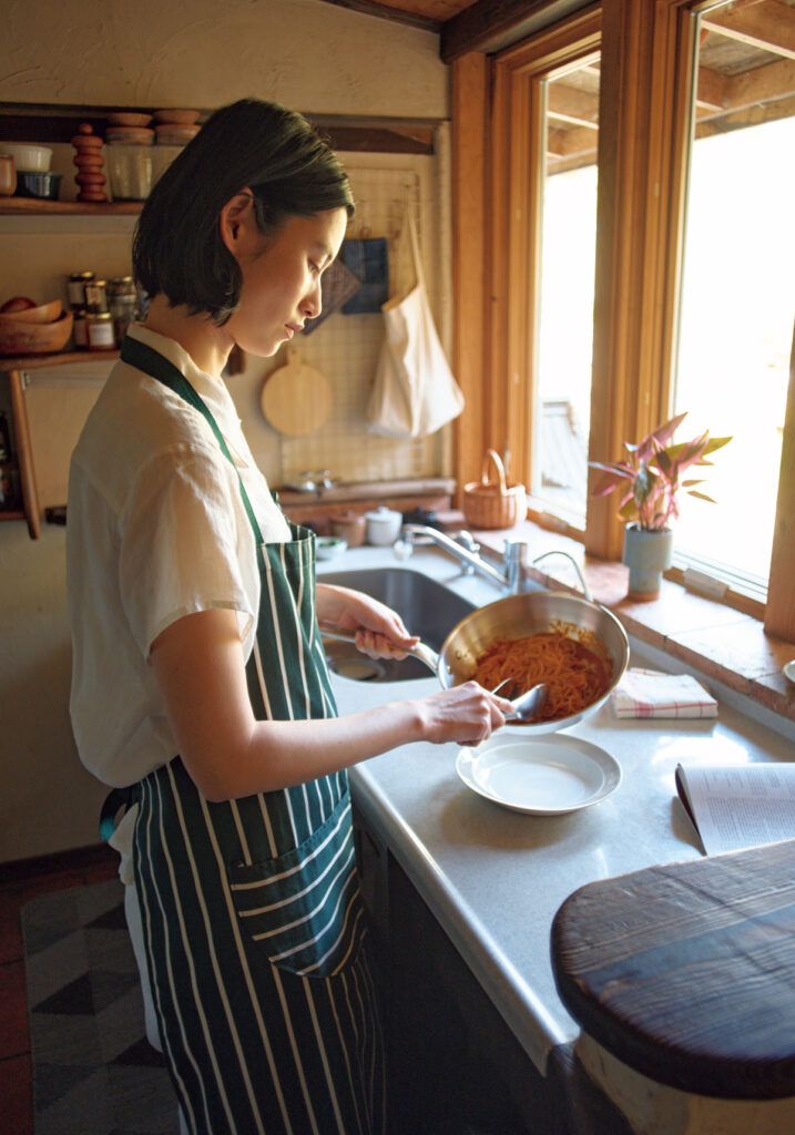 キッチンに立つのがたまに億劫なときも、ブッチャーストライプが目に入るとやる気が出てくるから不思議だ。ロンドン最古の肉市場、スミスフィールドマーケットで働く人々に長きにわたり愛される〈ラッシュブルックス〉のエプロンは、大容量のポケットが付いていたり、首掛けの長さを調整できたりと、必要十分に機能的。厚手でハリのある生地感で、きゅっと腰紐を絞ったときの感触もいい。¥7,480(マークスインターナショナル 03−6861−4511) シャツシャツ¥29,700(A.P.C./アー・ペー・セー カスタマーサービス 0120−500−990)、フライパン∅24㎝¥7,150(中尾アルミ製作所 03−5830−2511) その他スタイリスト私物