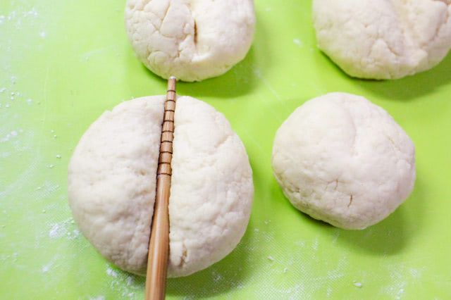 手で丸めた生地の真ん中に菜箸を置き、押し当ててひと筋付けます。この成形で、ハイジの白パンのような、かわいい形に焼き上げていきます♪