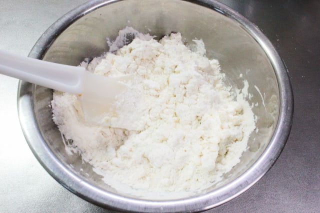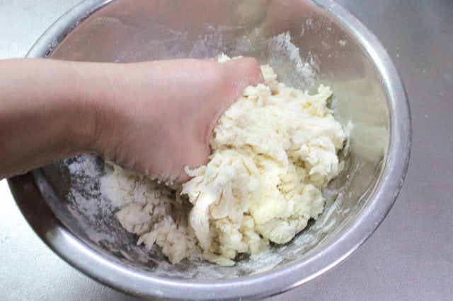 シリコンベラで切るように混ぜるだけでは粉気がなくならないので、手で捏ねるようにひとまとめにします。