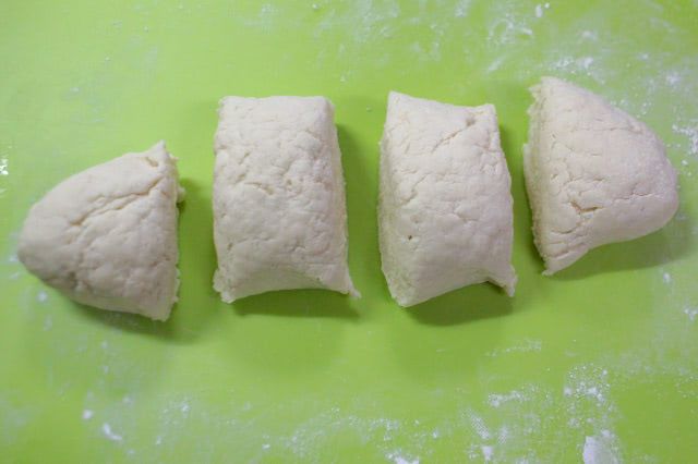 4. 薄力粉(分量外)を振った台で生地を転がしながら棒状に成形し、4~5等分に切ります。