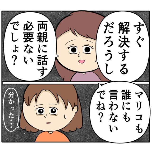 「すぐ解決するだろうし、両親に話す必要ないでしょ?マリコも誰にも言わないでね?」