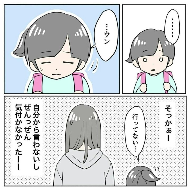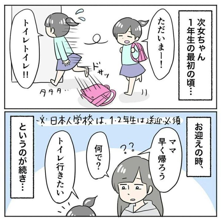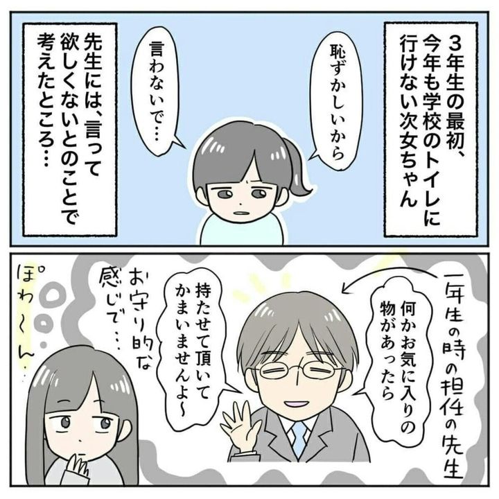 まりまりさんの次女は、当時小学校1年生。ある日、まりまりさんは次女が学校でトイレに行けていないということに気が付きます。保育園のころと違い、先生の声かけもなく、休み時間の間に次の授業の準備をする必要があり、場面緘黙症の次女には少しハードルが高いようです。