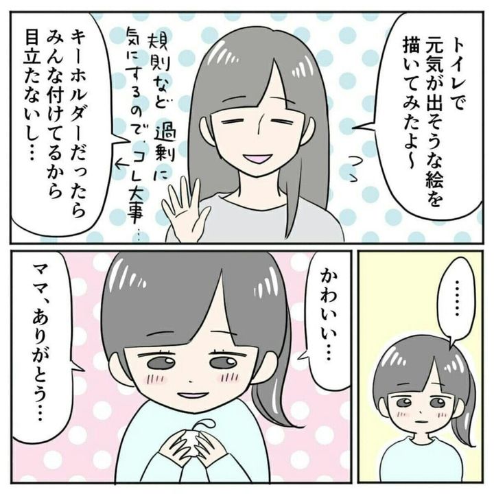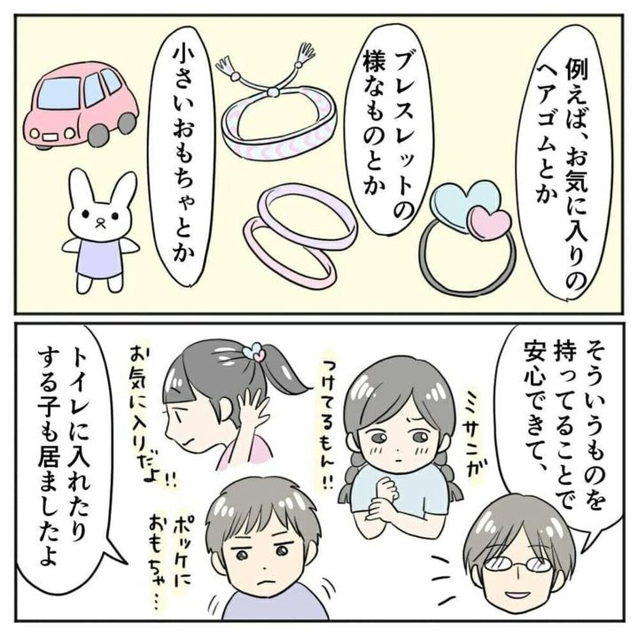 1年生のころの担任の先生のアドバイスを思い出したまりまりさん。娘のために心を込めた「お守り」を手作りします。次女の性格を一番理解しているからこそできた「お守り」。これには次女もとてもよろこんでいる様子です。