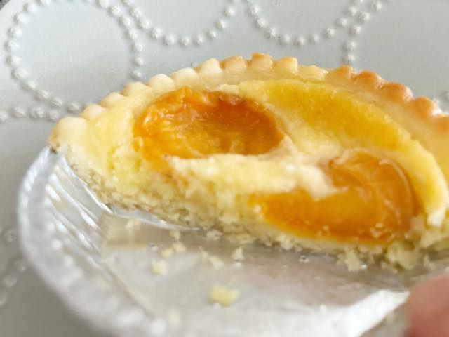 断面はこちら。食べてみると、ジューシーなアプリコットとソフトな生地がどこか家庭的で懐かしさを感じる味わいです。スイーツ店のタルトというよりは家庭で作ったタルトに近いです。少し残念だったのが翌日に食べたためか、タルト生地が少し水っぽくなっていました。