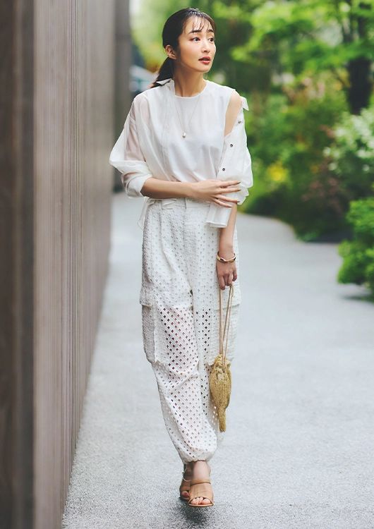 シアーシャツ¥16,500/ジャスグリッティー タンクトップ¥8,800/ドレスレイブ(ジオン商事) レースパンツ¥33,000/ジル スチュアート ネックレス¥34,100/プラウ バングル¥3,900 /soie(ロードス) バッグ¥6,590、ミュール¥6,590/ともにZARA(ザラ)