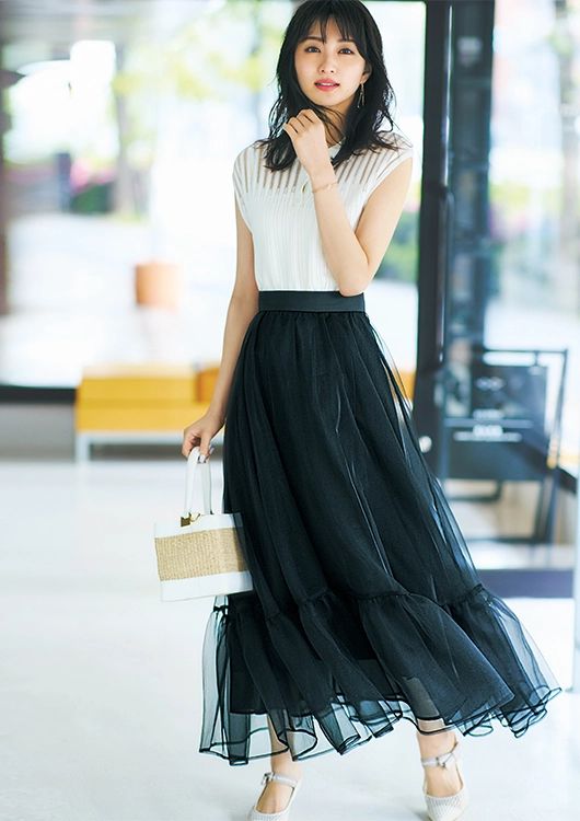 モノトーンの美人なムードを透け素材でさらに高めて女っぽく。