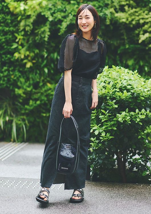 メッシュトップスを主役にした夏の軽やかオールブラック。