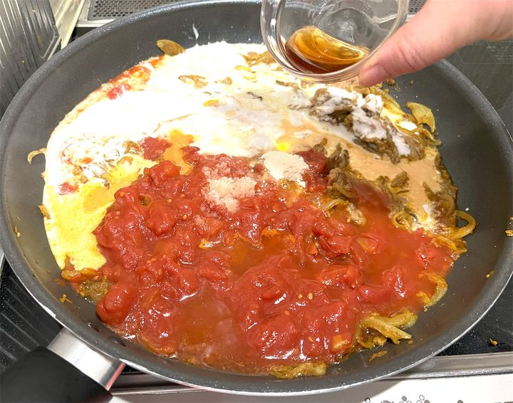 4のフライパンに、カットトマトとココナツミルク、ナンプラー、てんさい糖、塩を入れてよく混ぜます。