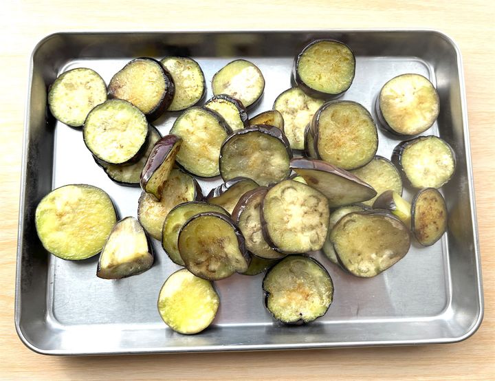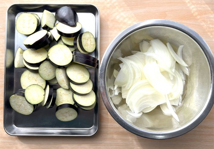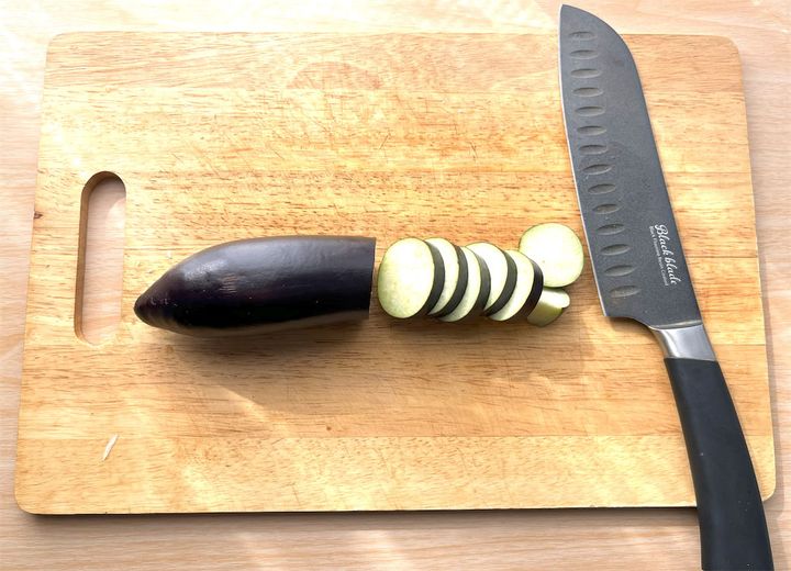 なすは、へたの部分を切り落としてから、皮のまま5mm~1cmくらいの厚さで輪切りにします。