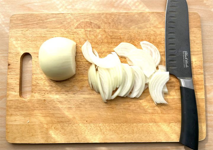 玉ねぎは皮を剥いて、半分にしたあと薄切りにします。