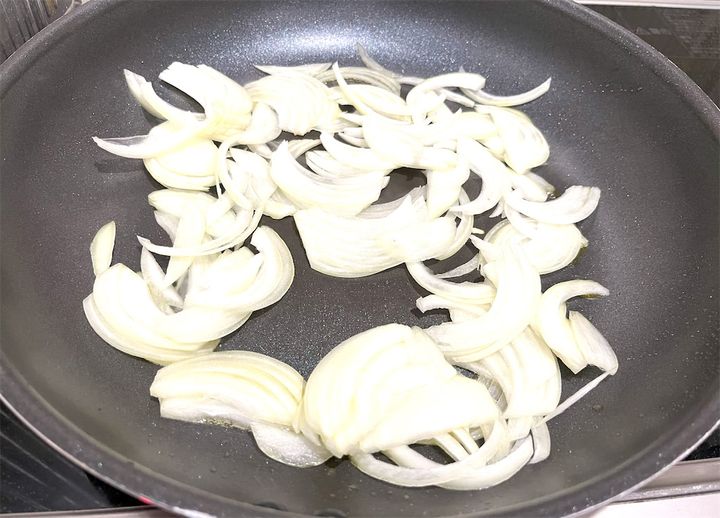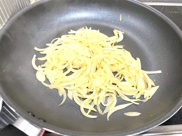 2でなすを焼いたあとのフライパンに、玉ねぎを入れて炒めていきます。