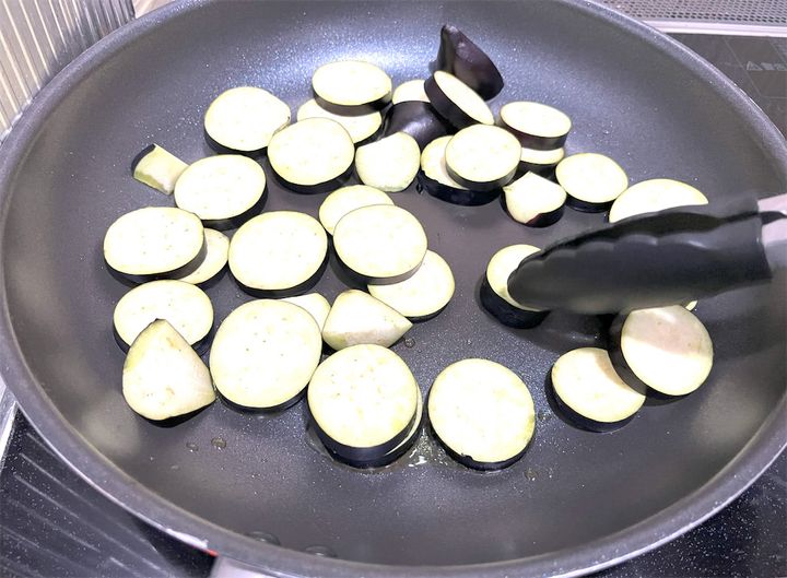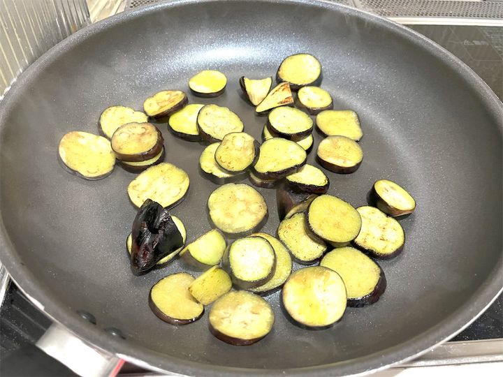 フライパンにオリーブオイルを入れたら、1のなすを入れて塩、こしょう(どちらも分量外・適量)を振って炒めます。