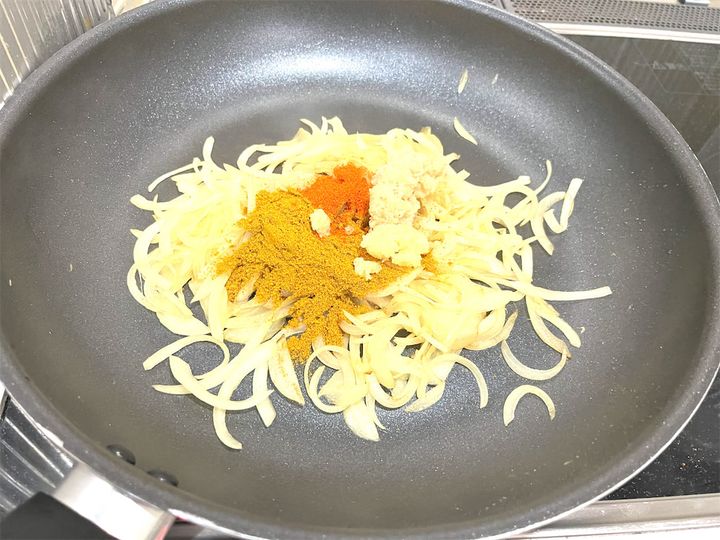そこへカレー粉とチリパウダー、にんにく、しょうがを入れて、煎るように炒めます。