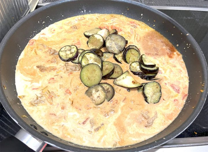 そこへ、2のなすをフライパンに戻して混ぜてから、沸騰後20分ほど弱火で煮込んでいきます。