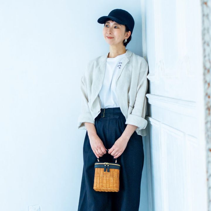 黒で引き締めた装いにミニサイズのかごバッグで抜け感を出し、おしゃれ度を上げて。