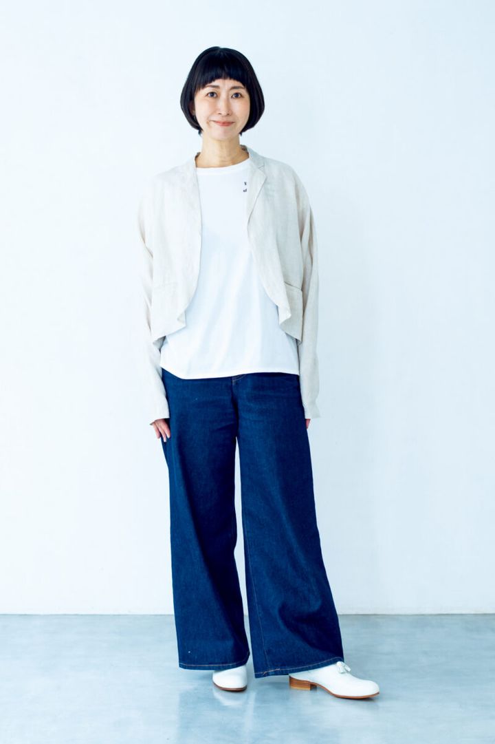 「太ももが張っているのでデニムは太めなものばかり。太ももを隠すため、よく丈の長い羽織りものを足して着ています。いつも同じ着こなしになるので最近、飽きを感じてきました」