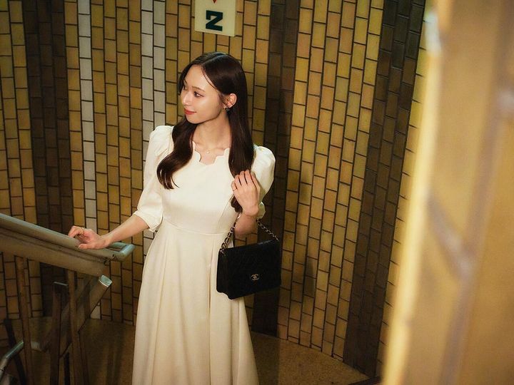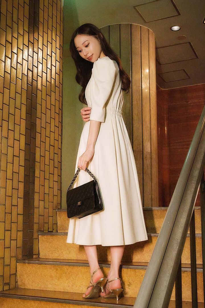 取材の日の私服。「『スウィングル』のワンピースは、パフスリーブや胸元のスカラップが可愛らしくてお気に入りです♡」と加藤さん。バッグはシャネルの「マトラッセ」、サンダルは「スナイデル」
