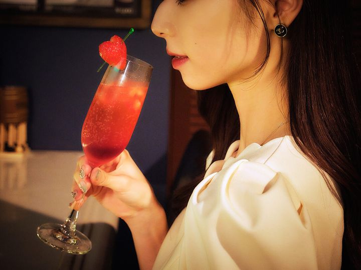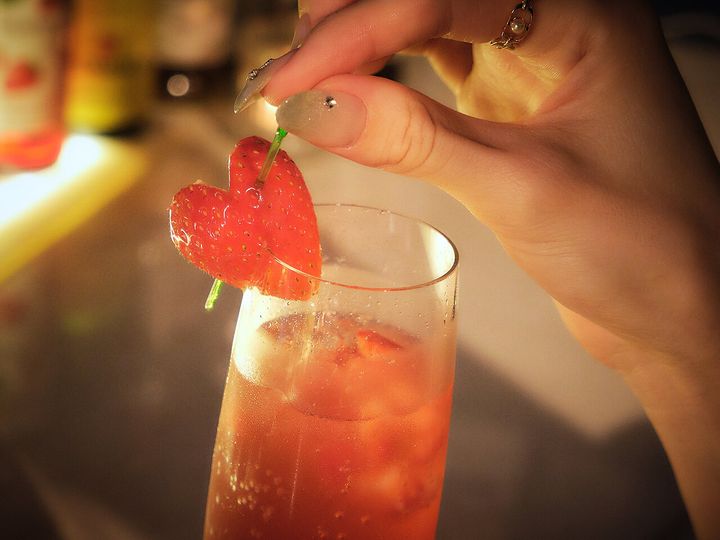 取材の日、加藤さんが1杯目にいただいたのは「いちごスパークリング」(¥1,200)。白ワインをベースに、フレッシュないちごのつぶつぶ食感がアクセントに。お酒があまり強くない人にもおすすめのカクテルだ