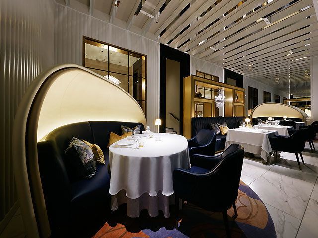 貝殻に包まれた造形のテーブル席は、開放的でありながらプライベート感も演出。暖かみのあるゴールドの空間はグラマラスで独創的だ
