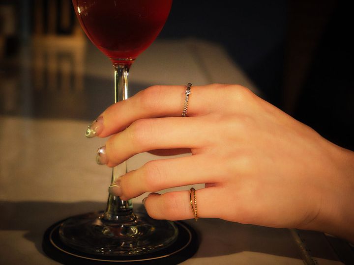 左手人さし指のリングは「モーブッサン」で祖母からのプレゼントです。小指のリングはルミネで買いました。